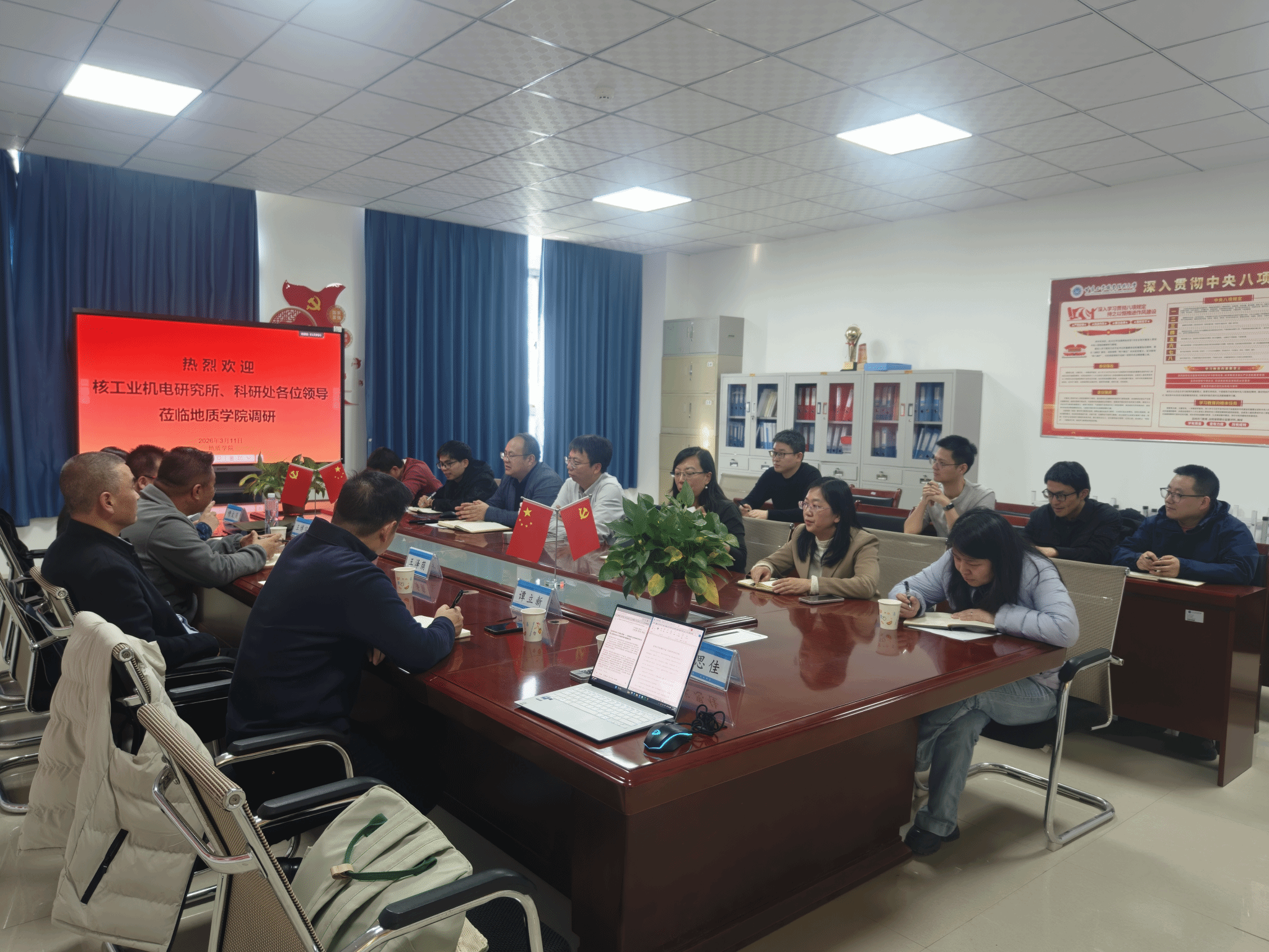 为深化院所协同发展,整合优质科研资源,推动核地质领域产学研用深度融合,2026年3月11日,研究所党委书记马涛、副所长王博宇、学校科技处处长王泽荫等一行6人,赴甘肃工业职业技术大学地质学院开展调研交流。地质学院党总支副书记李立、副院长李玲玲及学院领导班子成员、骨干教师代表参加。